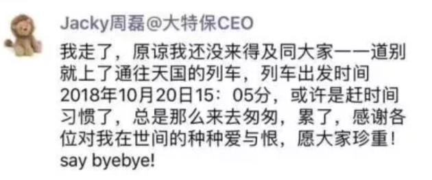 10月20日,大特保创始人、CEO周磊,因突发心脑血管疾病,不幸去世,享年45岁。