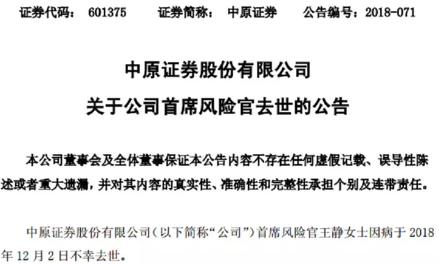 12月2日,中原证券首席风险官王静因病去世,享年50岁。
