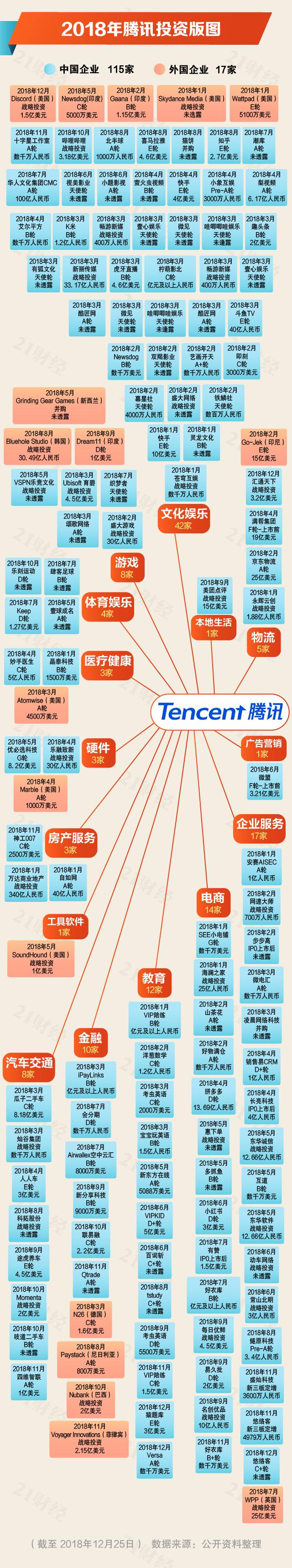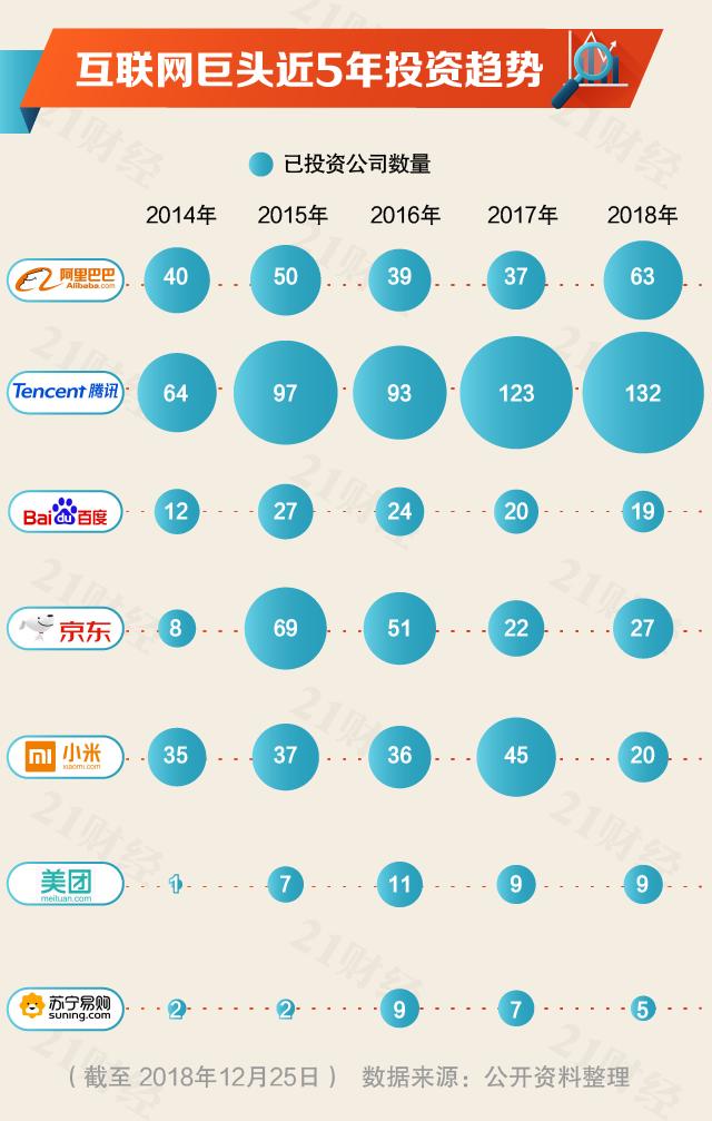 2018年腾讯对外投资创新高,在BAT巨头中领先,目前已投资公司达132家;