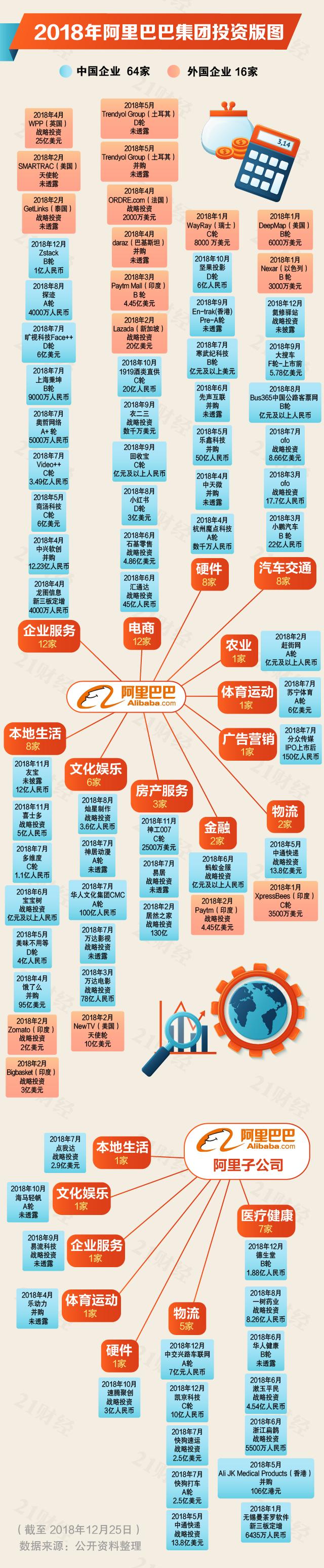 2018年,阿里巴巴(不含子公司)出手达63家,也创下投资数量新高,约为腾讯的一半;