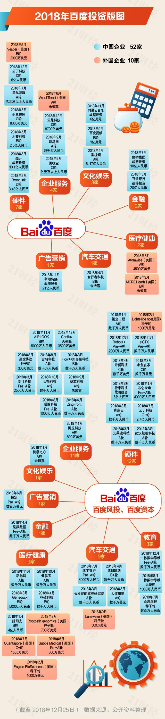 2018年仅百度(非集团)投了19家,因被指投资落后于阿里和腾讯,百度于2016年成立百度风投、百度资本后投资加速,2018年整个集团投了超过60家公司。