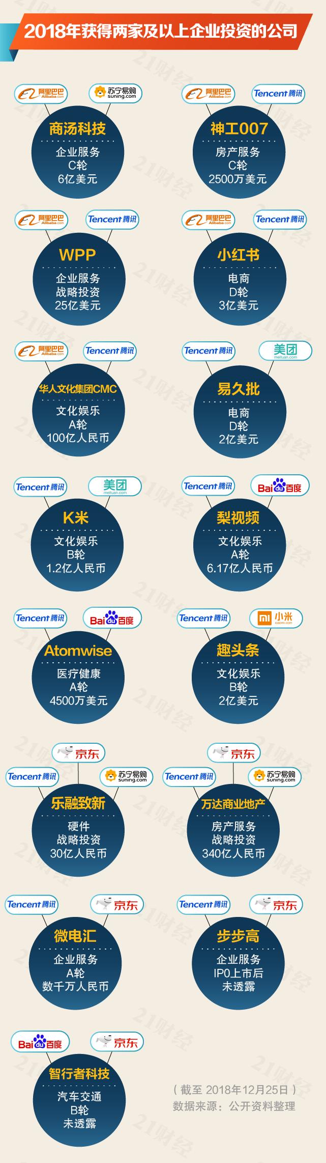 ②其中,腾讯、小米合投趣头条,腾讯、京东、苏宁等以340亿人民币入股万达商业地产,阿里巴巴和腾讯共同投资WPP、小红书、华人文化集团CMC等公司。
