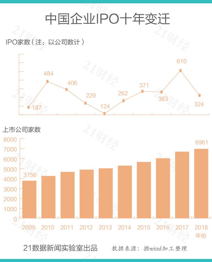 据21数据新闻实验室统计,2018年共有324家中国企业通过IPO登陆资本市场(包括药明康德与格陵兰收购两地上市),占全球IPO总数的24%;首发募资合计4047亿元(人民币,下同),占全球IPO募资总额的29%。至此,中国上市公司数量已达6961家。