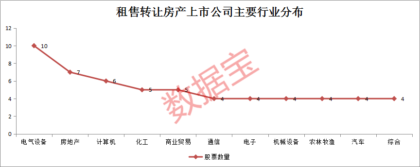 据数据宝不完全统计,2018年有82家上市公司对自有房产进行处置,包括出售、出租、抵押或转让等,而处置时间大部分集中在第四季度。 其中,非房地产公司数量有75家,占比超九成。这75家公司广泛分布于22个申万一级行业,电气设备公司数量居首,共有12家;计算机、化工、商业贸易行业公司数量均超5家。传媒和家用电器行业各有1家,分别是新华传媒和顺威股份。