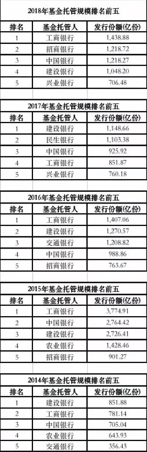 而从最近5年,基金托管前五名来看,工商银行3次登顶基金托管规模榜首,建设银行也两度冲上冠军宝座,招商银行今年也取得了最近5年托管业务最好成绩。