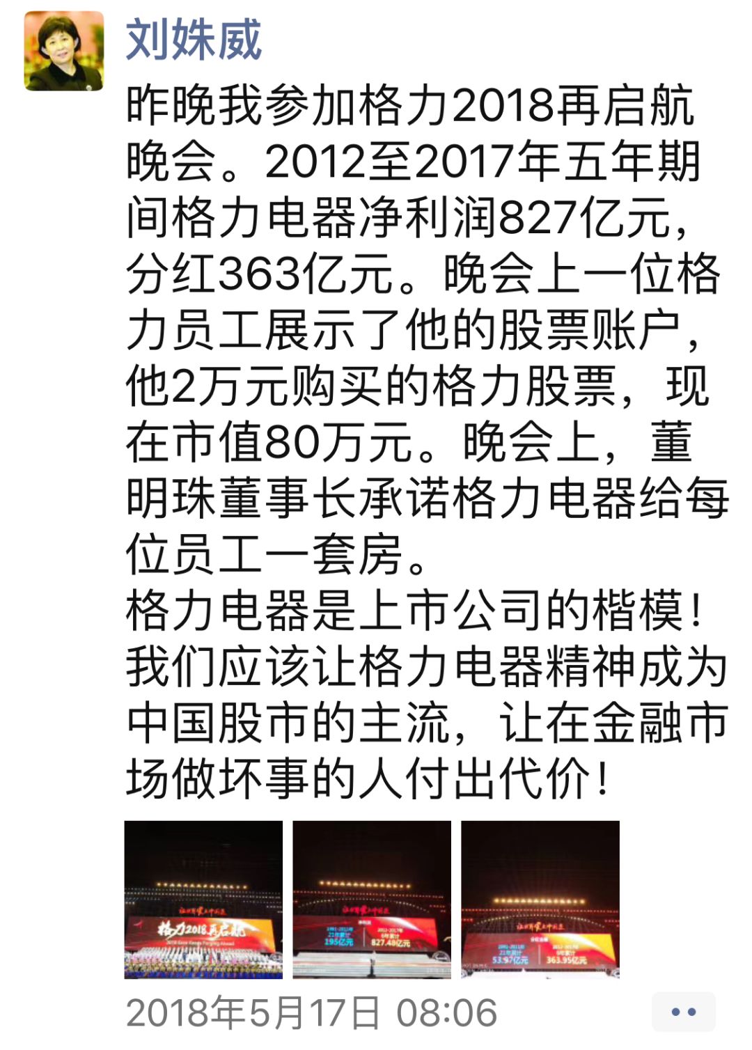 2018年5月15日,刘姝威在微信朋友圈称:“飞抵珠海,与我的闺蜜——格力电器董事长董明珠相聚!”5月17日,刘姝威又在微信朋友圈晒出了前一晚上参加格力2018再起航晚会的照片。