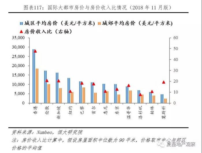 据Numbeo网站2018年11月数据,香港城区平均房价2.88万美元/平方米,郊区平均房价1.85万美元/平方米,房价收入比达到47.81倍,绝对房价与房价收入比均位居国际大都市前列。