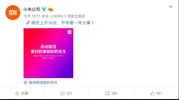 可以佐证的是,在雷军发布微博之前,小米公司的官方微博也发了一条信息,称“明天上午10点,开年第一件大事!”,配图则是“永远相信美好的事情即将发生”,而这句话正是红米手机的宣传语。