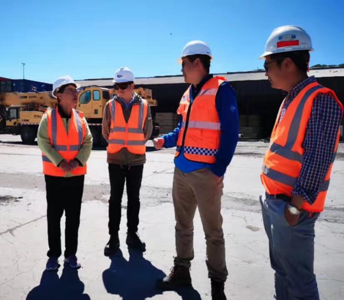 在中国港湾智利项目部会议室,中港智利项目部经理孙健、中港智利区域工程项目副经理孙栋、圣文森特项目技术负责人荀明智向我演示了准备的PPT,并进行了深入交流。