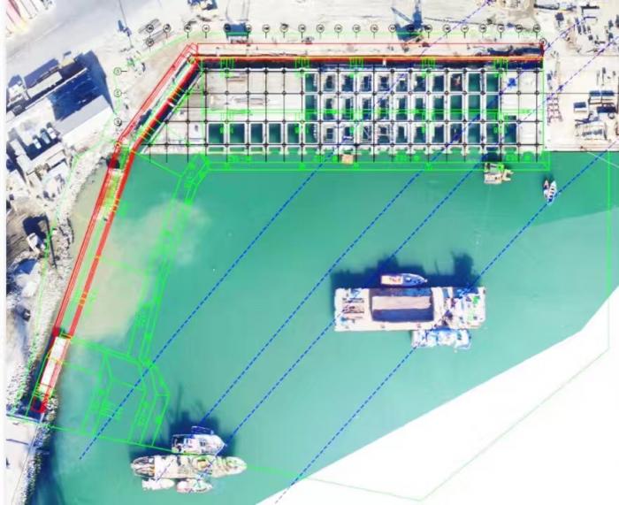 建于1911年、深埋水下的防波堤。中间两条蓝线是梯形防坡堤的上底,旁边两条蓝线是下底,覆盖了新开挖港池的大部分。