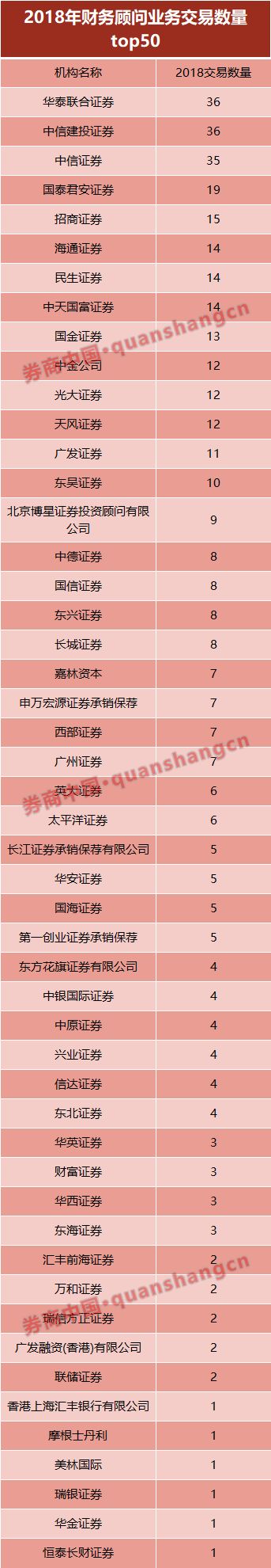 从2018年上市公司并购重组项目数量来看,共有29家券商拿到超过5个(含5个)并购重组项目。其中,华泰联合证券和中信建投证券并购交易项目数量最多,达36宗。