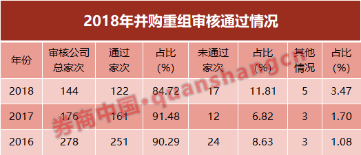 2018年,证监会并购重组委共审核了144起上市公司重组申请,其中有122家通过,17家未获通过,即,2018年并购重组审核过会率为84.72%。