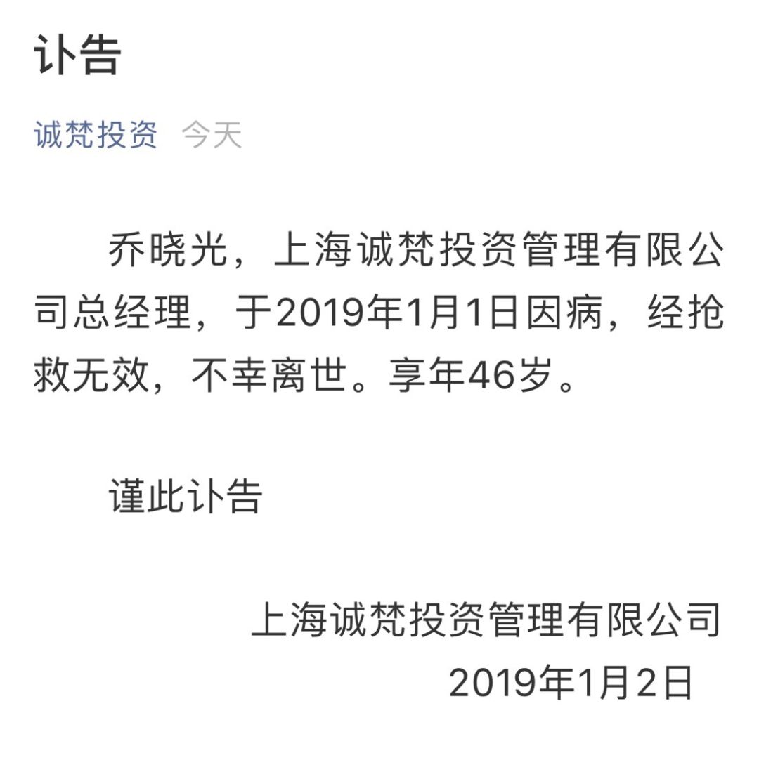 乔晓光,上海诚梵投资管理有限公司总经理,于2019年1月1日因病,经抢救无效,不幸离世。享年46岁。