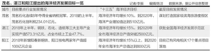 阳江谋划海洋经济发展,并非广东省的孤例。21世纪经济报道记者注意到,广东不少沿海城市在其海洋经济“十三五”规划中吹响了发展海洋经济的号角。比如,深圳市提出将建设“海洋强国示范区”置于城市和经济发展战略的核心位置,到2020年海洋生产总值达3000亿元;湛江市提出获批全国海洋经济发展示范区,到2020年海洋经济总产值突破2500亿元。