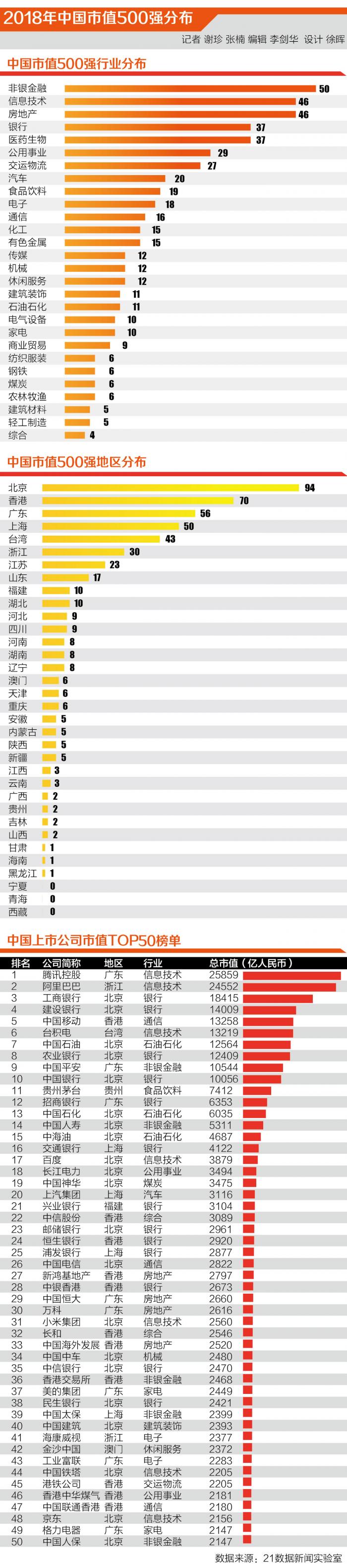 2018年12月30日,21数据新闻实验室汇总上海、深圳、香港、纽约等15个交易所上市公司最新市值数据,发布“2018年中国上市公司市值500强榜单”(完整榜单参见“21财经APP”)。