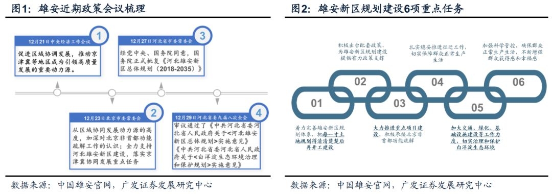 我们认为,雄安新区定位“千年大计”,总体规划落地后配套规划和大规模开工速度将加快:1)《雄安新区总体规划》《白洋淀生态环境治理和保护规划》等重要纲领性文件不断完善,推动落地支持新区发展;2)近期多项会议表示建设雄安新区,促进京津冀协同发展是明年区域协调的一项重点工作。