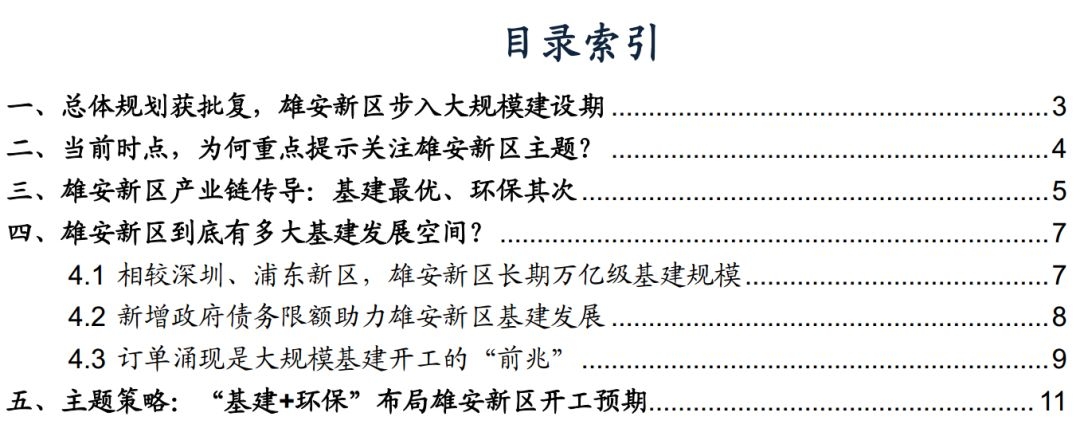 主题策略层面,我们建议关注规划获批后可能加速落地的开发规划、实施规划、大规模开工等催化剂,围绕“基建+环保”产业链布局: