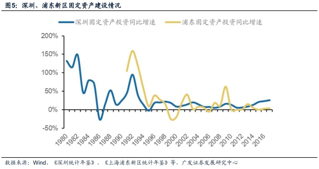 我们分阶段对固定资产投资增速进行测算,可以发现,深圳、浦东两新区发展轨迹稍有不同。我们将时间划分为初期(1-5年),中期(6-15年)与长期(16-25年)三个阶段对深圳和浦东新区固定资产投资额年均复合增速进行测算,得到深圳新区的历史增速分别为14%、12%与15%;浦东新区的历史增速分别为29%,4%与9%,可以看出深圳新区固投增速增速较为平稳,而浦东新区初期增速较快,中长期增速回落较为明显。