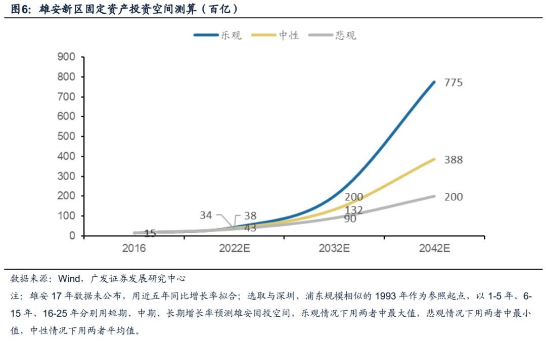 参考深圳与浦东新区固投增速,我们按照乐观、中性、悲观三种情况分别对未来5、15、25年雄安新区固定资产投资累计规模进行测算。在三种情况下,雄安新区短期内规模均超过3000亿,长期内规模均超过2万亿。