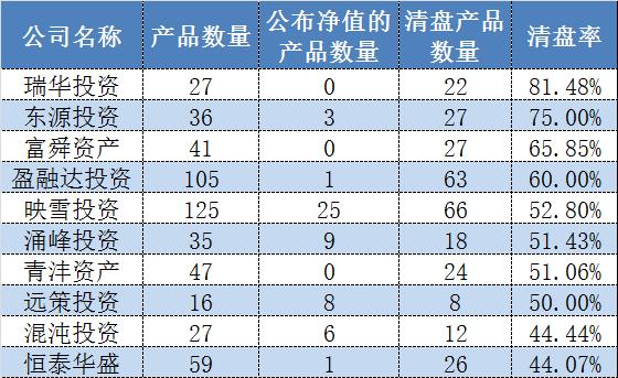 另外,界面新闻梳理发现,曾经登上百亿私募榜单的55家私募中,有10家清盘产品数量占其发行产品总数的四成以上,而其中的绝大多数目前已经退出了百亿私募之列。