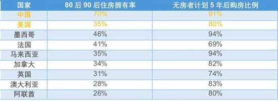 这也印证了汇丰银行(HSBC)2018年发布的一份报告。报告从调查中发现,中国的80、90后年轻人的住房拥有率高达70%,远远超过第二名墨西哥的46%,也是美国(35%)的2倍水平。不仅如此,中国年轻人买房的积极性也位于全球前列。在没有拥有住房的80和90后中,有91%的人计划在未来五年内买房。