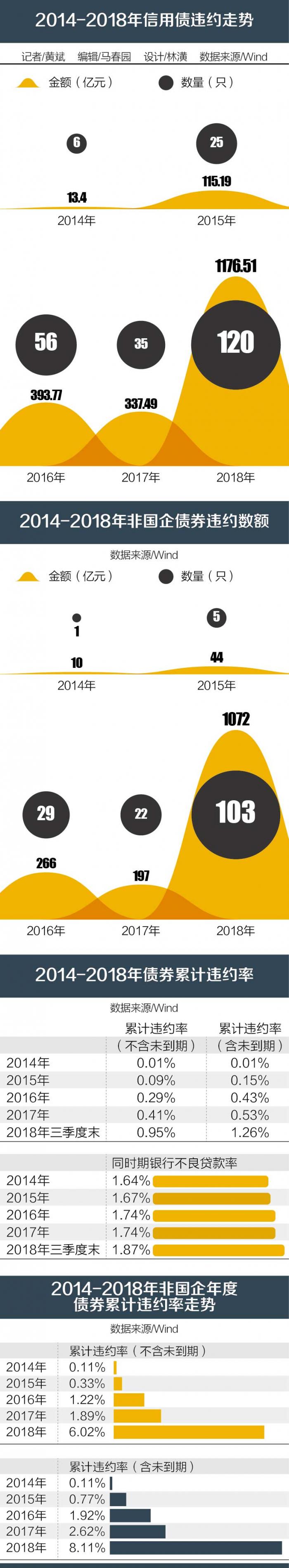 Wind数据显示,2017年,债券违约数量和金额为35只、337亿元;2018年跳升至120只、1177亿元,违约金额增加了约2.5倍。