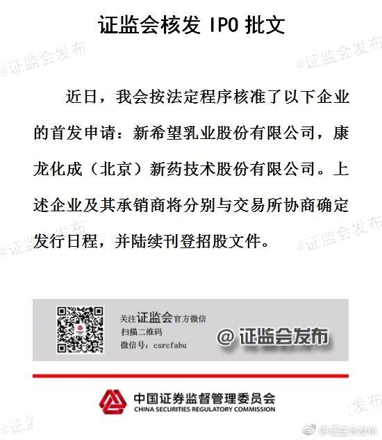 近日,证监会按法定程序核准了以下企业的首发申请:新希望乳业股份有限公司,康龙化成(北京)新药技术股份有限公司。上述企业及其承销商将分别与交易所协商确定发行日程,并陆续刊登招股文件。
