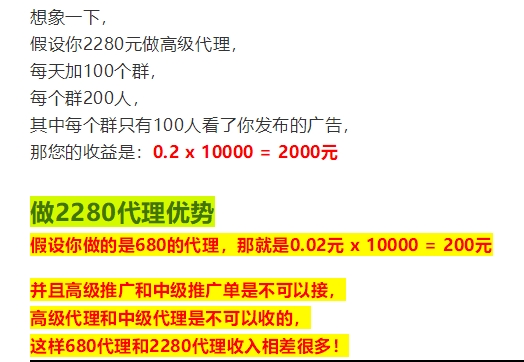 “三种代理价位的代理商在做任务后逗可以有权利收代理赚钱。代理价位不同,赚钱利润则不同,比如680元价位的不能收1280元和2280元价位的代理商,但如果是高级别的代理则三个价位的代理都可以收。”