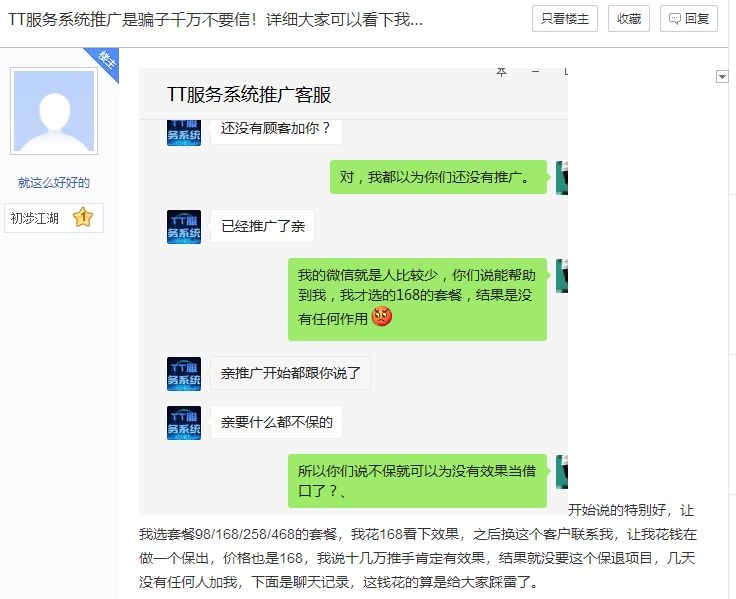 但在贴吧、微博等平台,不少人反映自己被骗,这其中包括交钱兼职的,还有真的希望通过这个平台推广的微商,根据聊天记录,推广套餐费用为98到468元不等,168就有十几万推手,没效果包退,但是购买项目几天也没有任何客户,推广客服表示“没有强迫决定”,有知情人士留言称,这些所谓的任务根本不会被发到各微信群里。