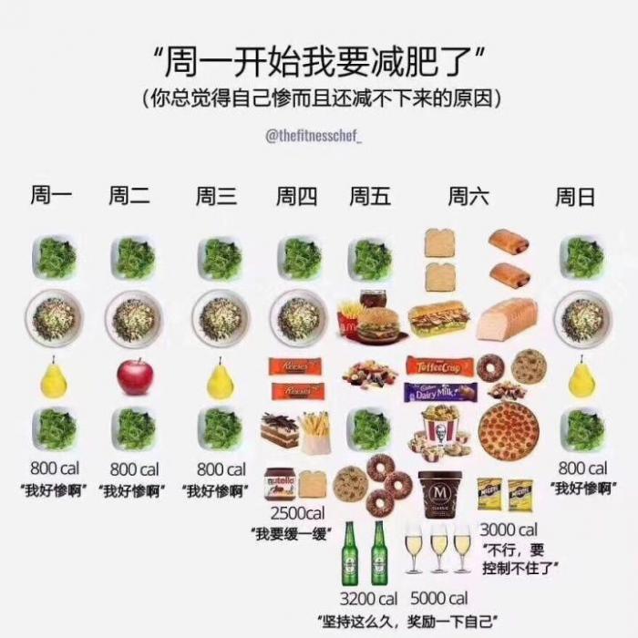 反复在“昨晚吃得太多了,今天中午吃沙拉!”和“中午吃得很不满足,晚上要犒劳一下自己!”之间恶性循环,摄入的热量永远超过消耗的热量。