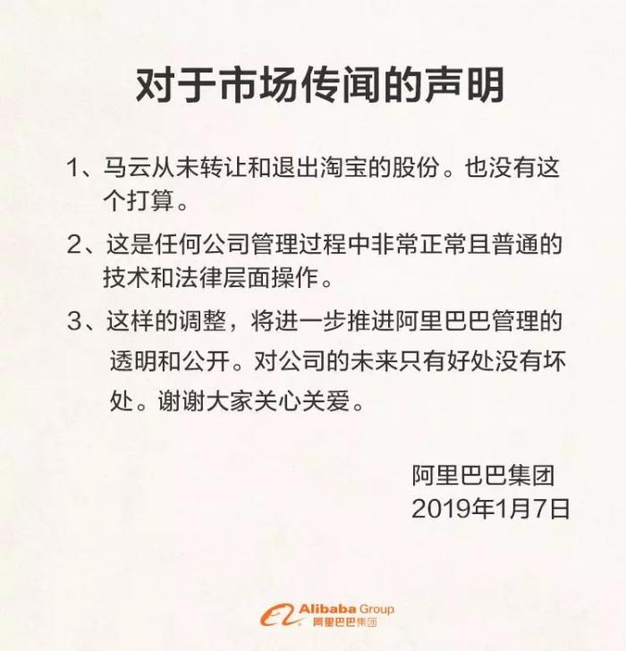 针对马云出清淘宝股权的市场传闻,阿里巴巴集团发布声明称:马云从未转让和退出淘宝的股份,也没有这个打算;这是任何公司管理过程中非常正常且普通的技术和法律层面操作;这样的调整,将进一步推进阿里巴巴管理的透明和公开。对公司的未来只有好处没有坏处。