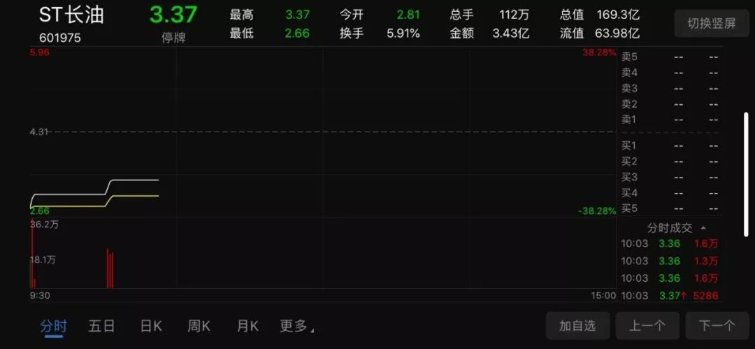 然而令人意外的是,今日集合竞价阶段,ST长油持续走低,开盘跌幅达34.8%;9点31分,当跌幅收窄至28.3%,公司公告宣布临时停牌。