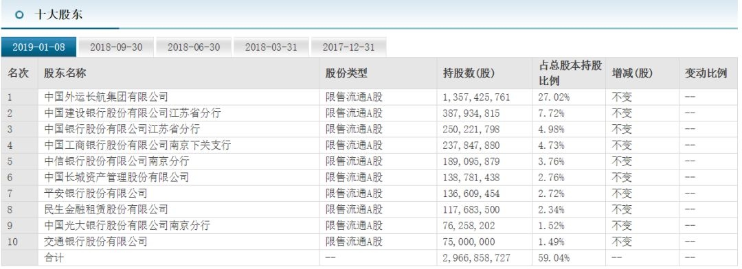 此外第五到第十大股东分别为中信银行南京分行、中国长城资产管理股份有限公司、平安银行、民生金融租赁股份有限公司、光大银行南京分行以及交通银行。