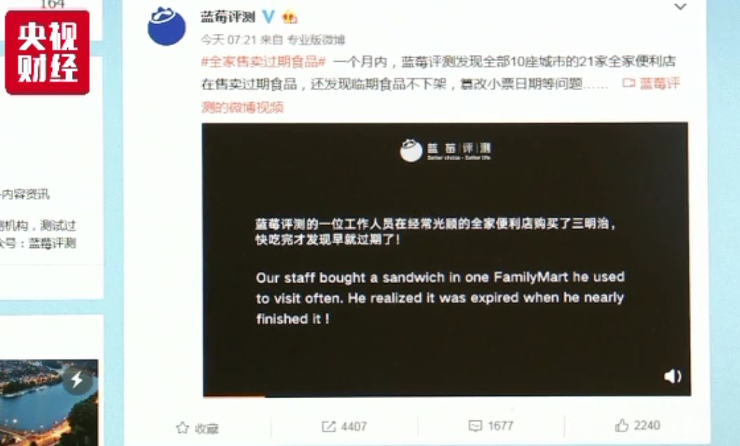 蓝莓评测副主编:我们对北京的几家全家便利店都展开了抽样调查,两周之内发现有6家北京的全家便利店售卖过期食品,随后通过全家的官网了解到全国其他有全家便利店的城市,在两周时间内对每个城市展开了类似北京的抽样调查,比较让人震惊的是所有城市都发现并现场买到了过期的食品,主要是三明治、蛋糕这些需要冷藏并且保质期比较短的食品。
