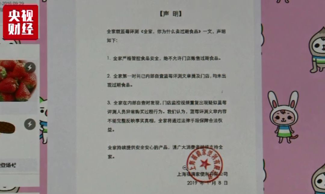 针对此曝光,8日下午14点27分,全家通过微博发表声明称,全家第一时间已内部自查蓝莓评测文章提及门店,均未出现过期食品。央视财经记者第一时间采访了中国全家新闻发言人,对方表示,文章内容不能完整反映事实真相,并提到全家在内部自查时发现门店监控视频重复出现疑似蓝莓评测人员异常购买过程行为。