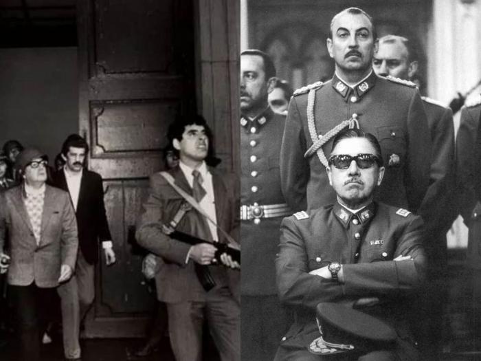 民选总统阿连德(左图左一);美国支持的皮诺切特(右图中)。