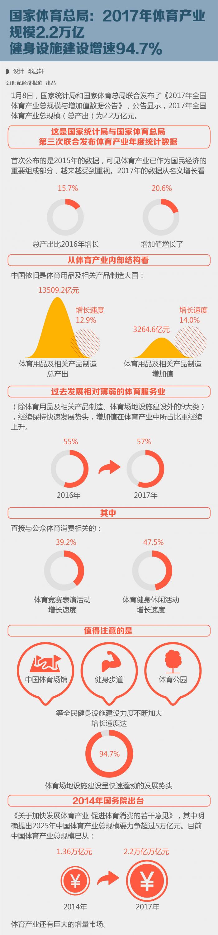 1月8日,国家统计局和国家体育总局联合发布了《2017年全国体育产业总规模与增加值数据公告》,公告显示,2017年全国体育产业总规模(总产出)为2.2万亿元。