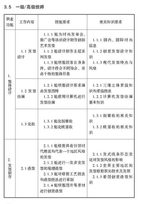 其中,一级/高级技师要能修剪具有引领时代潮流和代表一个地区风格的发型,能为时尚发布会、推广会等活动设计制作创新艺术发型,能化新娘妆、晚宴妆。