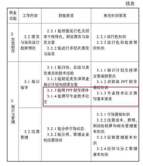 要想成为职业中的一级/高级技师,除了要具有相关的专业技术能力之外,还要能够编写教案或者授课方案、会使用PPT多媒体教学,并且对市场经营管理能力提出了一定的要求。