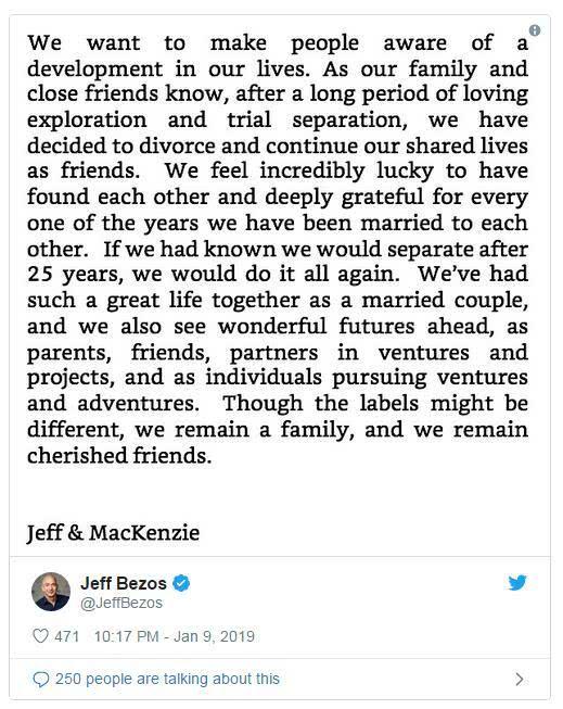 贝索斯:“我想向公众告知我们生活中发生的一件事情。我们的家人和亲友已经知道了这个消息。在经历了很长时间对爱的探索和分居之后,我们已经决定离婚,未来将作为朋友继续生活下去。对于过去能找到彼此,并度过那么多年的婚姻生活,我们感到无比幸运。即使知道我们会在25年后离婚,我们也不会后悔重来一遍。过去,我们作为夫妻生活得非常幸福,未来我们也将作为父母、朋友生活下去,在投资和项目上继续合作,但也会以个人独立的身份进行新的投资,开始新的冒险。尽管这些标签对我们来说很难,但我们还是一家人,仍视对方为珍视的朋友。”