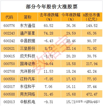 数据宝统计显示,剔除部分次新股后,去年跌幅不足10%或者是逆市上涨的股票,只有11只股票今年以来大涨超15%。其中,5G概念龙头股东方通信去年大涨超60%,今年再接再厉大涨36.36%。创投概念龙头通产丽星位居今年涨幅榜第二位,达到29.59%,该股去年涨幅超过74%。涨幅榜第三位是中昌数据,今年大涨22.46%,去年小幅下跌6.43%。