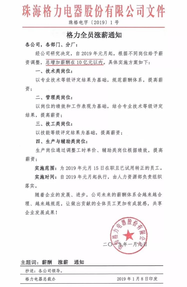 继2016年、2018年两次宣布全员加薪一千元后,2019年1月8日晚,格力电器一份“全员涨薪”的通知文件又在网上热传,称格力全员涨薪,总增加薪酬在10亿元以内。格力电器相关人士当晚向南都记者证实了这份通知的真实性,称具体加薪以该通知为准。