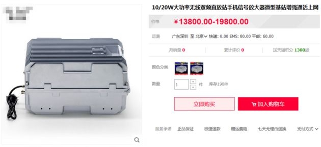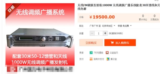 记者在淘宝网站以“1000w调频广播发射机”“基站”等关键词进行搜索,出来不少出售相关产品的商家,售价从几千到几万元不等。这些工具一旦被不法分子利用,极有可能组装成“黑广播”或“伪基站”,向公众传播非法内容。