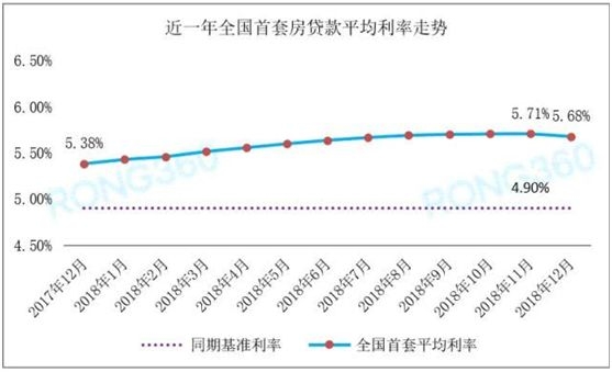 近期,融360大数据研究院发布最新监测数据显示,2018年12月份,全国首套房贷款平均利率为5.68%(相当于基准利率1.159倍),环比11月份下降0.53%,这是全国首套平均利率23个月以来首次出现下降!