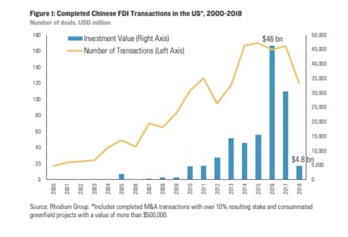 报告还指出,如果计入中资在美国退出的投资,那么2018年的直接投资净值为负数,该机构称2018年,中资在美国的投资退出规模达到了130亿美元,就意味着净值为-80亿美元。