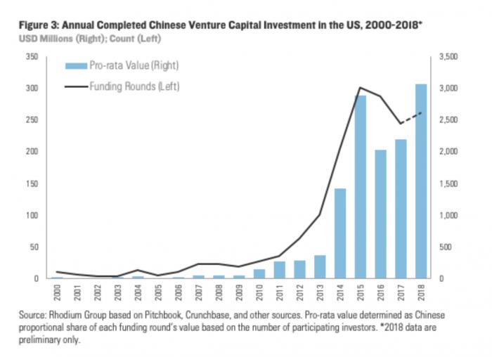但值得注意的是,尽管直接投资规模下降了,中资对美国的风险投资出现了明显的增长,2018年的总规模达到了历史新高的31亿美元,2017年的总规模为21亿美元。