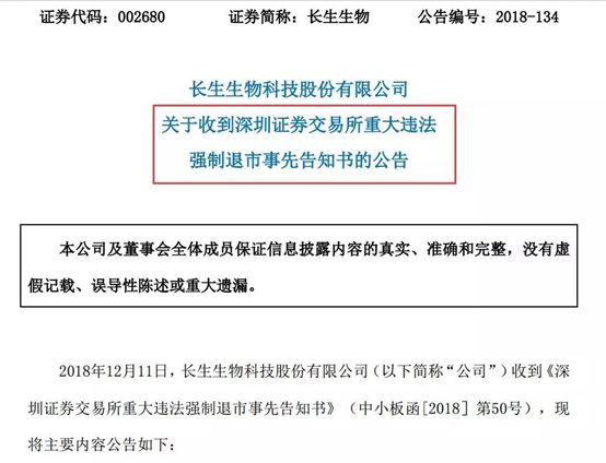 2018年12月11日,长生生物公告称,公司收到《深圳证券交易所重大违法强制退市事先告知书》(中小板函[2018]第50号)(下文简称事先告知书)。