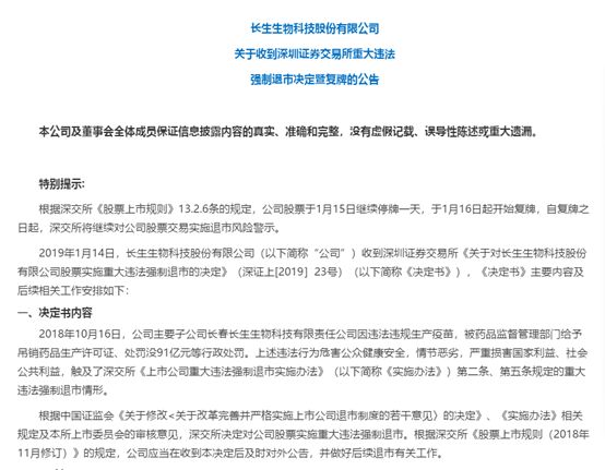 公告指出,2019年1月14日,公司收到深交所《关于对长生生物科技股份有限公司股票实施重大违法强制退市的决定》(深证上[2019]23号)(以下简称《决定书》),根据《决定书》, 公司主要子公司长春长生因违法违规生产疫苗,于2018年10月16日被药品监督管理部门给予吊销药品生产许可证、处罚没91亿元等行政处罚。上述违法行为危害公众健康安全,情节恶劣,严重损害国家利益、社会公共利益,触及了深交所《上市公司重大违法强制退市实施办法》第二条、第五条规定的重大违法强制退市情形。根据中国证监会《关于修改<关于改革完善并严格实施上市公司退市制度的若干意见>的决定》、《实施办法》相关规定及深交所上市委员会的审核意见,深交所决定对公司股票实施重大违法强制退市。