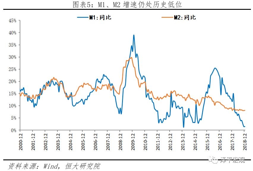 货币宽松,信用仍紧,人民币表内贷款增长幅度不及表外萎缩幅度,货币供给收缩,融资形势持续紧张。2018年,受金融去杠杆、资管新规影响,表外融资大幅萎缩,全年新增人民币贷款同比多增1.46万亿元,但表外融资同比少增6.5万亿元,表内信贷增长幅度不及表外萎缩程度,融资形势紧张。此外,表外转表内,银行信贷增加,相应损耗银行的存款准备金,必然带来货币供给的压力,货币供给M2增速一直在8%低位波动。因此信贷回表本身就带来了一定程度的紧缩。
