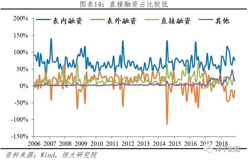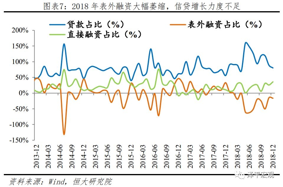 表内融资方面,在防范化解重大金融风险的背景下,表外转表内是趋势所在,伴随货币政策从宽货币到宽信用,预计表内贷款仍是社融的主力。2018年央行出台一系列政策鼓励、支持、甚至协助金融系统将银行表外资产负债转到表内,包括下调拨备覆盖率监管要求、4次降准、使用TMLF、通过优先股补充银行资本等。1月初央行工作会议指出,2019年要继续防范化解重点领域金融风险,有序化解影子银行风险。表外回表仍是趋势所在,在经济下行压力加大、非标大幅萎缩、表内信贷增长有限的条件下,政策侧重点转向“开正门,堵偏门”。近期央行通过加大再贷款再贴现,年初降准,调整普惠金融定向降准动态考核标准等政策,支持中小微企业表内融资,同时推行信贷、债券、股权“三支箭”政策组合为民企小微企业“补血”。